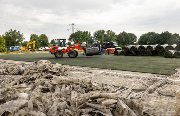 Voor de zomer zijn de sportvelden opgeruimd. Het kunstgras is verwijderd, er is een laag aarde aangebracht en gras ingezaaid. Hierdoor oogt het perceel weer verzorgd en netjes. Daarnaast hopen we door het gras regelmatig te maaien te voorkomen dat beschermde diersoorten zich in de bodem nestelen. Dit zou de voortgang van het project namelijk aanzienlijk kunnen vertragen.